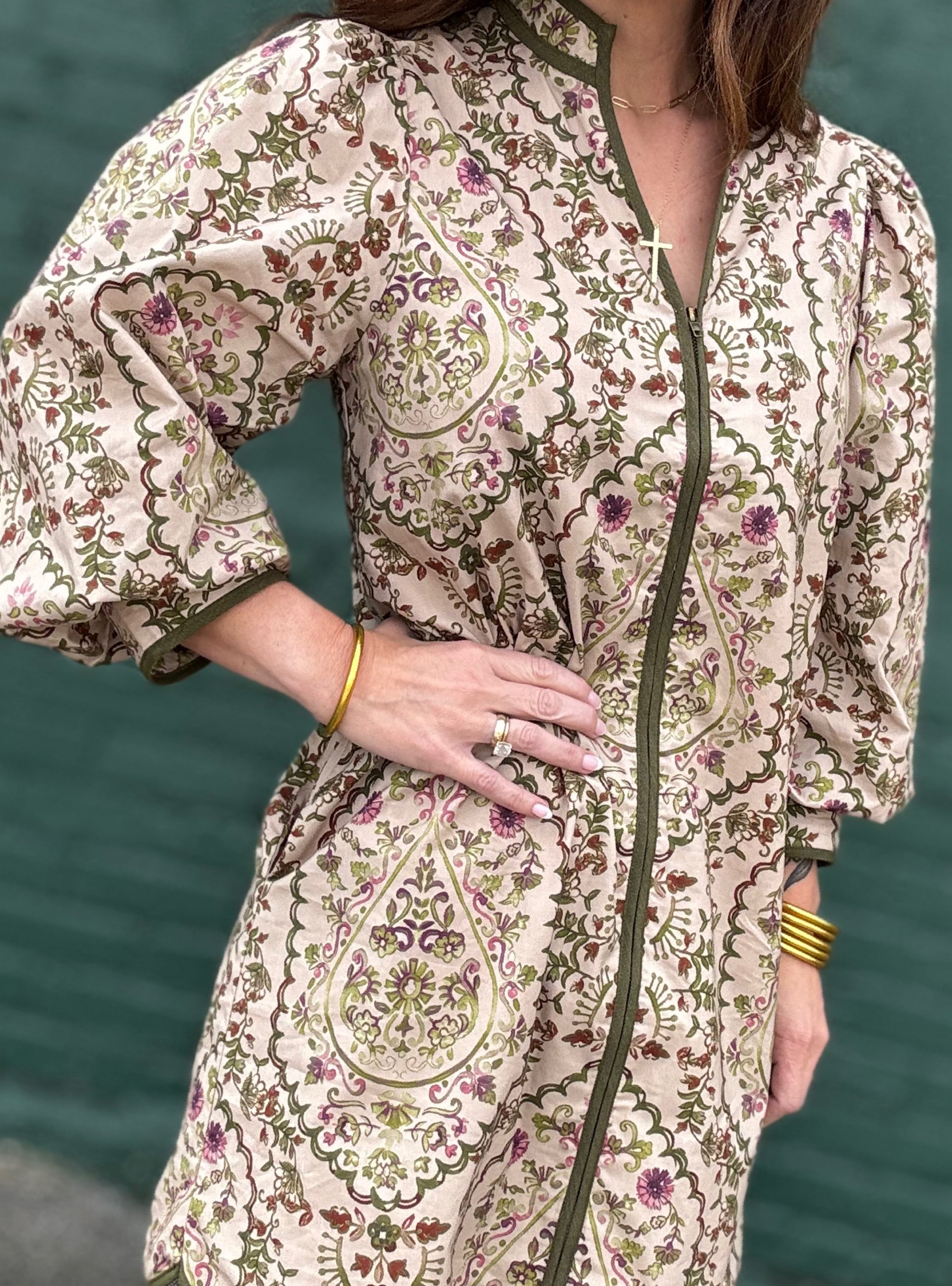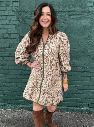 Say hello to your new favorite fall dress. This floral 3/4 length puff sleeve dress brings effortless charm with its vintage inspired print and flattering A-line silhouette. The soft, neutral base pairs beautifully with earthy greens and soft mauves, while the contrast trim adds a polished touch. Pair it with boots for fall or dress it up with heels for your next event — either way, it’s a total showstopper.