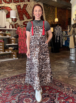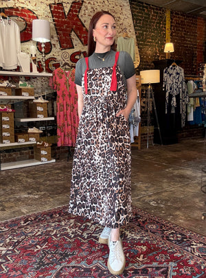 This animal print midi dress can be worn year-round depending on how you choose to style it. The adjustable red straps provide the perfect fit and allow you to manipulate the length as well. Finished with pockets and a relaxed tiered design.