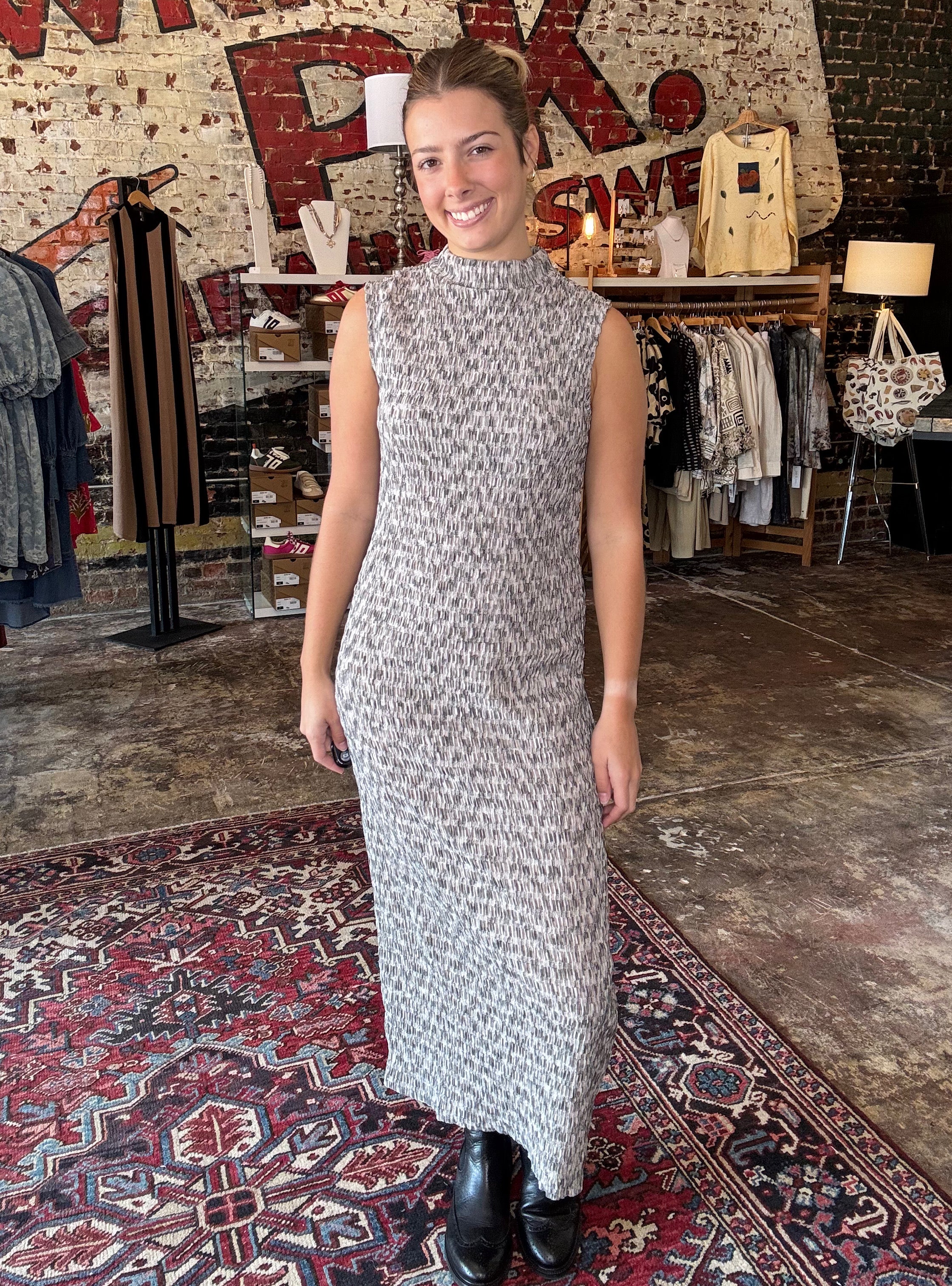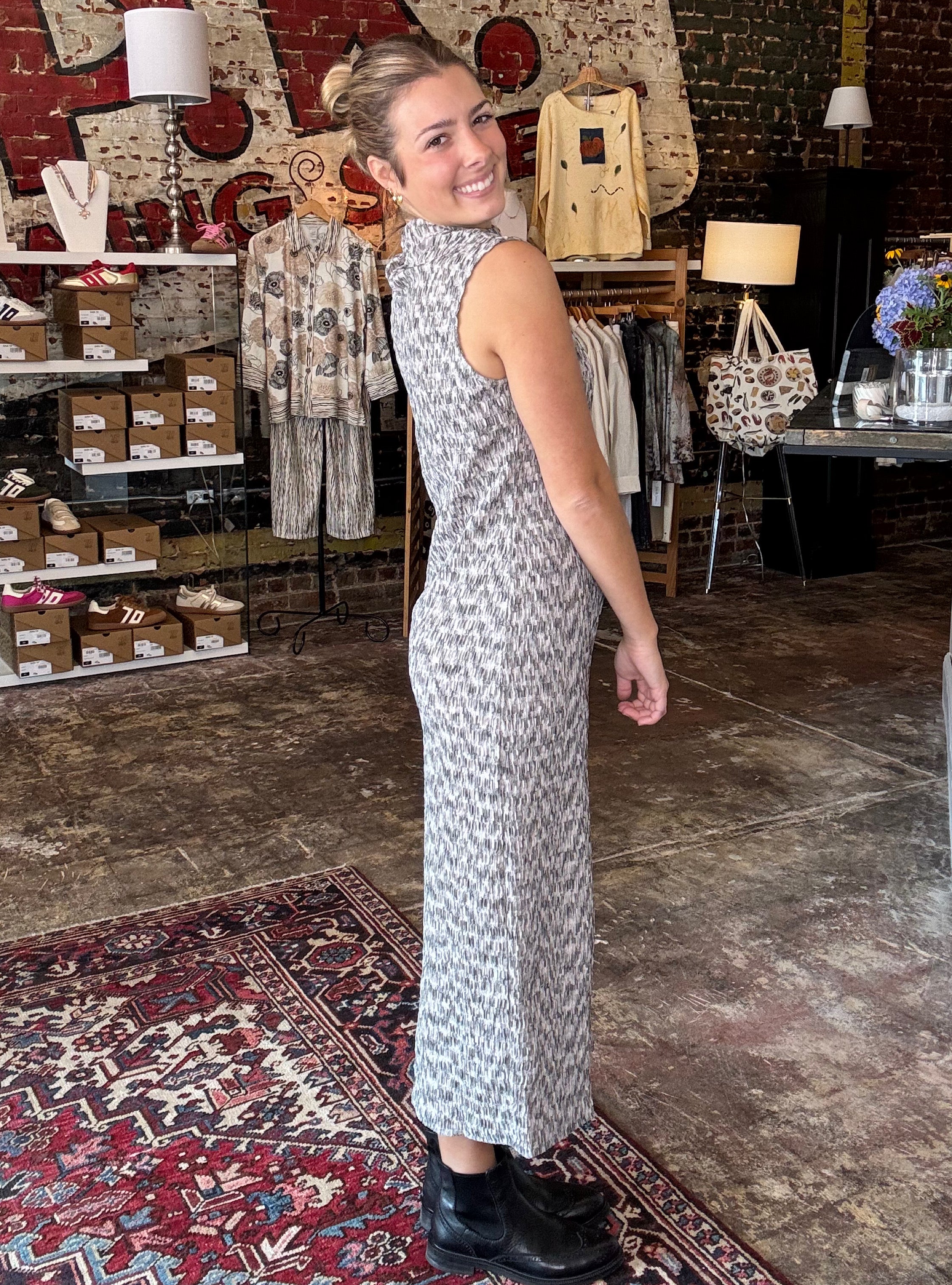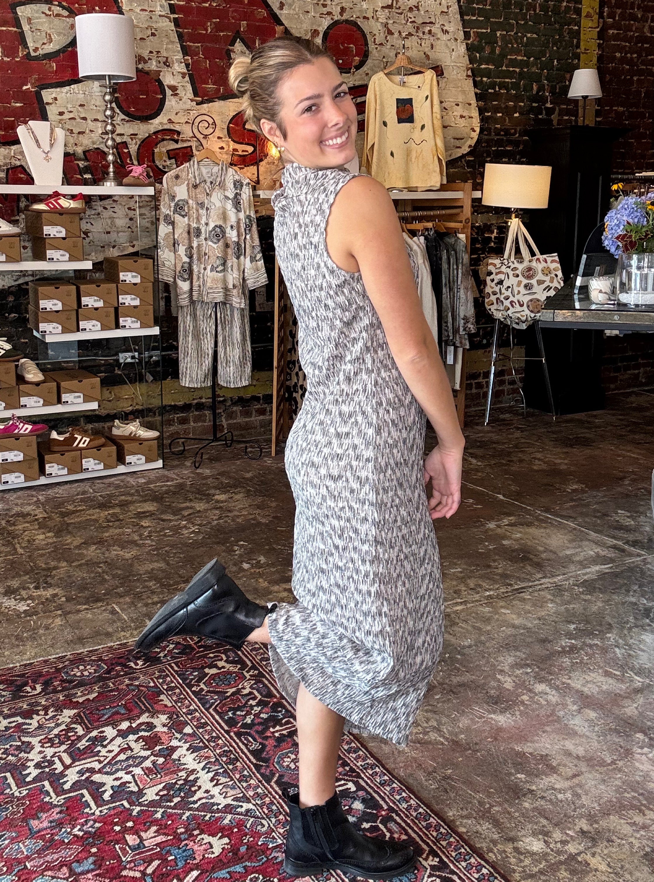 This sleeveless mock neck maxi dress is the perfect blend of minimal and chic. Featuring a soft heathered gray and ivory abstract knit, it’s designed with a straight, streamlined silhouette that skims the body for an effortless, elongated look. The lightweight, stretchy fabric ensures all-day comfort while keeping it versatile enough to dress up or down. Pair it with boots for an edgy vibe or sneakers for a laid-back, casual style — this dress transitions seamlessly from day to night.