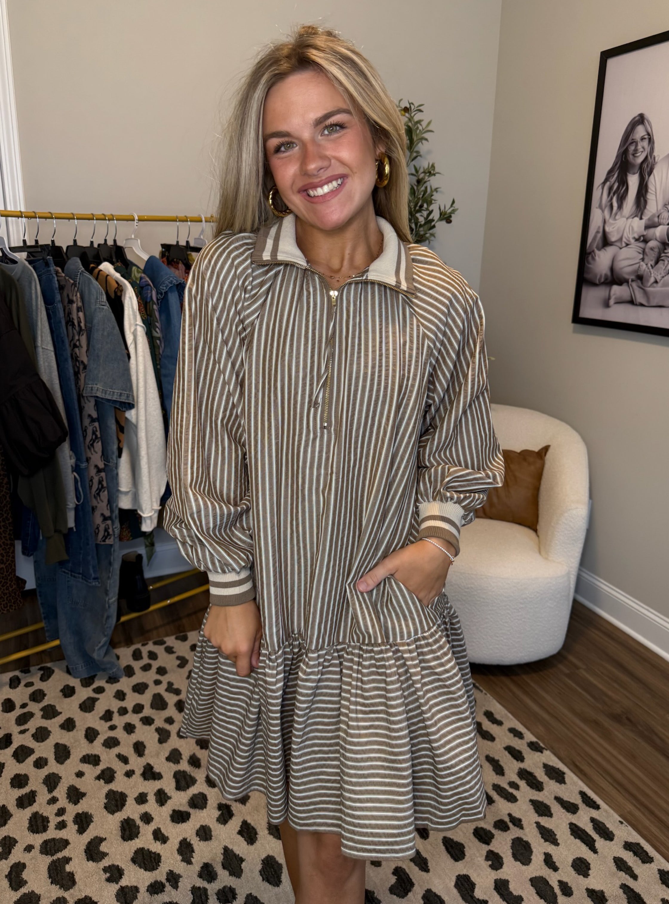 Featuring soft neutral tones, a relaxed fit, and a subtle drop waist ruffle hem, it brings effortless charm to any day. The collared neckline and half zip detail add a touch of sporty polish, while the lightweight fabric keeps it comfy for all day wear.