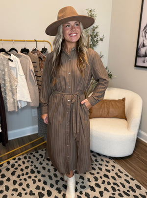 Step into effortless sophistication with this mocha pinstripe shirt dress. Featuring a button down front, tie waist belt, and subtle vertical stripes, it creates a timeless silhouette that’s both flattering and versatile. The long sleeves and midi length make it perfect for transitioning through the seasons, while the neutral tone pairs seamlessly with your favorite boots or layered accessories. Style it with a wide-brim hat for an elevated fall look or keep it classic with simple gold jewelry.