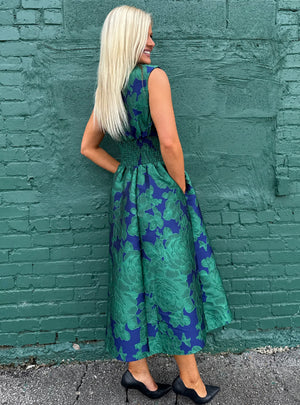 Bold, elegant, and oh-so-chic — this dress is a true showstopper. The rich navy backdrop with oversized emerald florals creates a luxe, statement making look perfect for special occasions or nights out. A flattering smocked waistband defines your shape beautifully, while the front zipper detail adds a modern twist to its timeless silhouette.