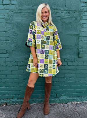 This playful swing dress brings retro charm with a modern twist. Featuring a vibrant patchwork of botanical block prints in shades of sage, olive, lilac, and golden mustard, it’s a statement piece that feels fresh and fun. The structured collar and half button-front detail give it a polished edge, while the relaxed, swingy silhouette keeps it effortlessly comfortable. Perfectly paired with boots for fall or sneakers for a casual day out, this dress is a go-to for vintage-inspired style lovers.