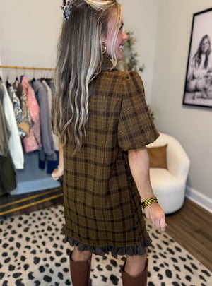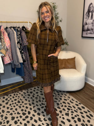 Meet your new fall favorite—a rich, retro inspired plaid dress that blends cozy charm with the cutest unexpected details. This brown + mustard check print brings all the warm, earthy vibes, while the half zip neckline adds a touch of modern edge. The puff sleeves give it that soft, feminine shape, and the contrast pockets + collar make the whole look feel elevated and intentional.