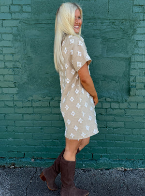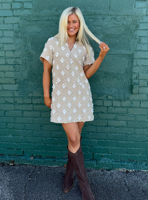 Textured, timeless, and totally effortless — this neutral shift dress by THML Clothing features soft white floral appliqués and a flattering v-neckline trimmed with a chocolate faux leather design. Style it with boots or sneakers for an instantly put-together look that works for any fall day.