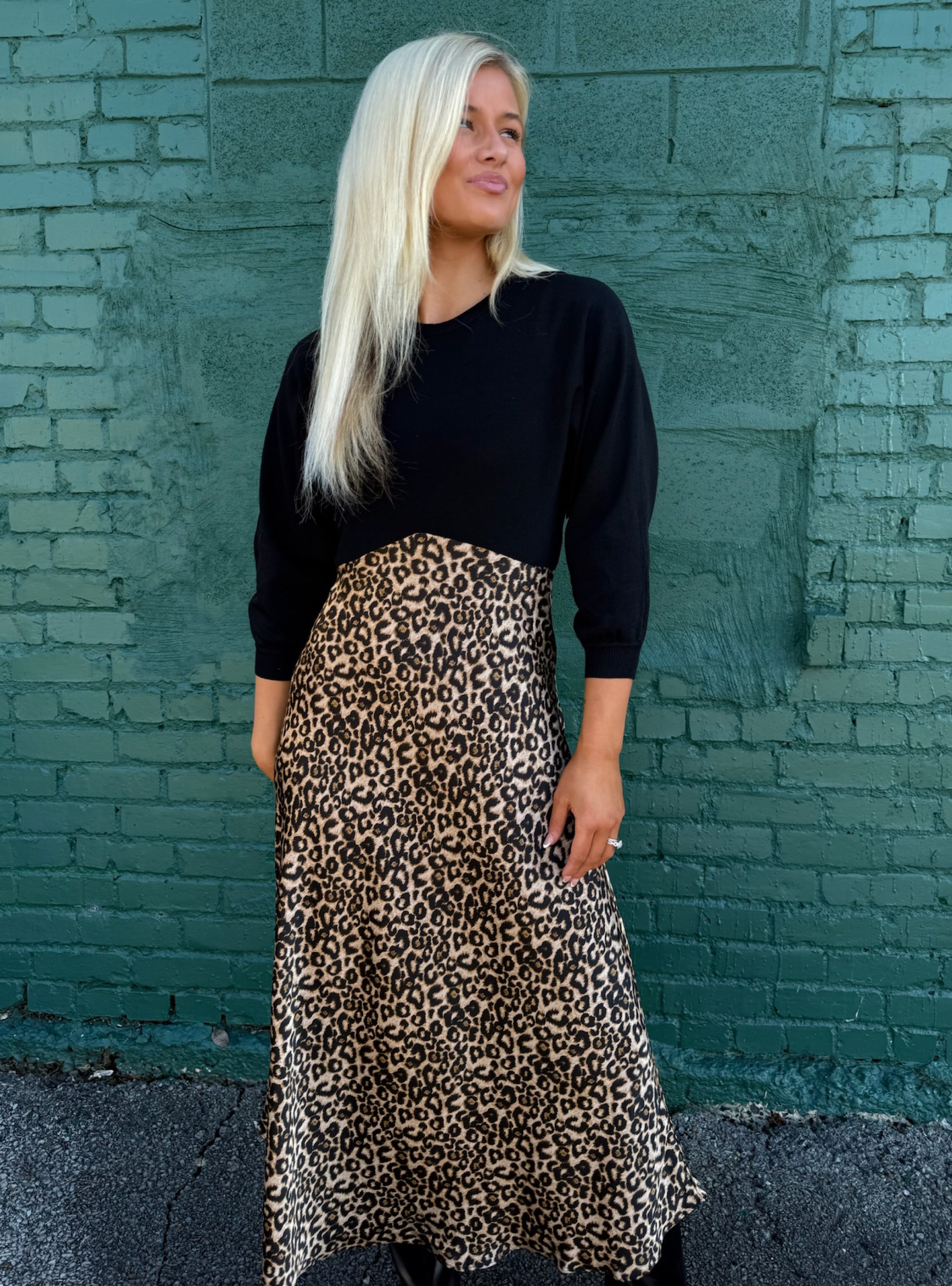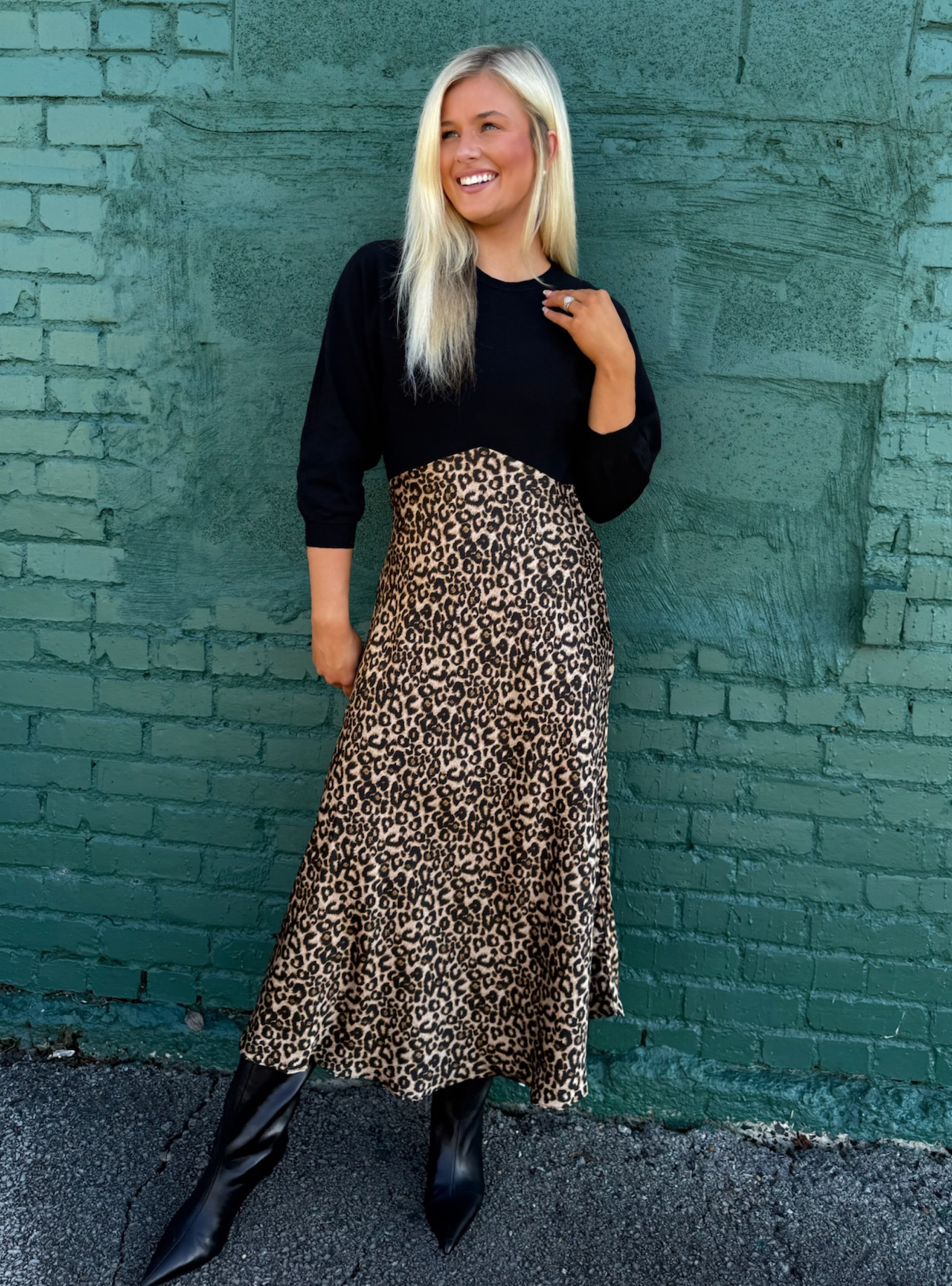 A little wild, a little cozy — this maxi length leopard dress is the best of both worlds. The soft black top gives laid back comfort while the silky leopard skirt adds just the right amount of sass. Style it with boots for a fierce fall favorite.