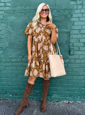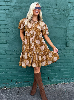 This floral babydoll dress by Uncle Frank is fall perfection with its warm, earthy tones and breezy silhouette. Featuring a button front design, collared neckline, and tiered ruffle hem, it strikes the perfect balance of casual charm and feminine flair. The puff sleeves add a touch of volume, while the lightweight fabric keeps it flowy and comfortable for all day wear.