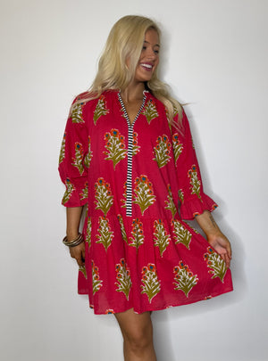 Bright, bold, and beautiful— this pomegranate floral dress is a showstopper. Featuring a relaxed tiered silhouette, playful ruffle sleeves, and eye-catching printed blooms, it’s the perfect blend of fun and effortless chic. The striped trim neckline adds a modern twist, making it easy to dress up with wedges or keep casual with sandals.