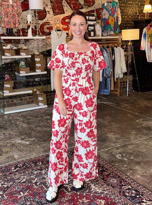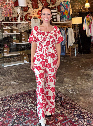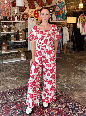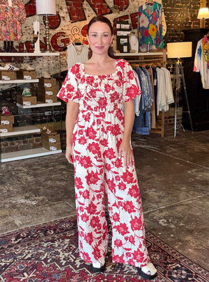 Your transition into summer style just got a whole lot chicer thanks to this adorable red and white jumpsuit. Made from a breathable cotton blend, this stunner is the perfect staple in your wardrobe. Finished with a relaxed fit, essential pockets, short sleeves, and a ruched bust line, this jumpsuit is an absolute sensation.