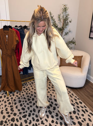 Meet your new off duty obsession. This buttery soft pale yellow matching set brings effortless comfort with an elevated vibe. The half-zip pullover features relaxed sleeves and a cozy funnel neckline, while the wide-leg joggers keep it comfy with oversized patch pockets and a drawstring waist.