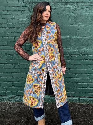 Designed with vibrant, hand inspired prints and rich autumn tones, this sleeveless layer brings effortless personality to any outfit. The textured quilting adds structure and warmth, while the contrasting trim and decorative buttons give it that artisan, one-of-a-kind feel.