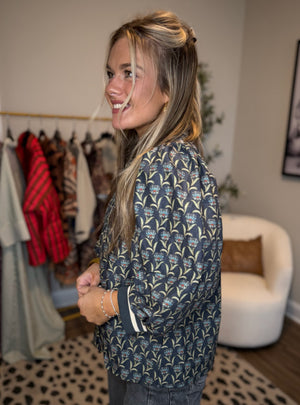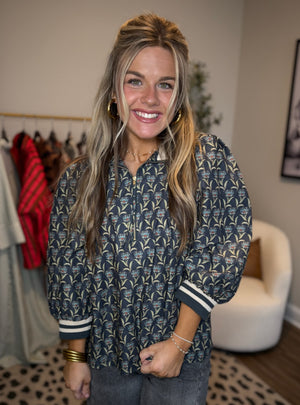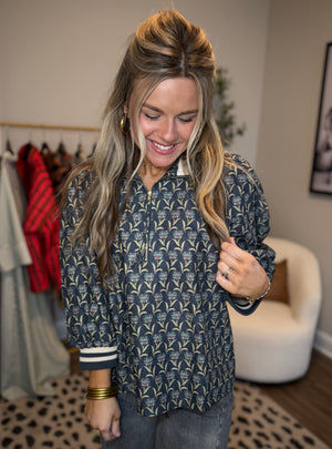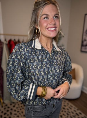 This top is such a vibe — a little vintage, a little sporty, and totally unique! The floral pattern gives it a soft, feminine touch, while the half-zip and striped cuffs add that cool, casual contrast.