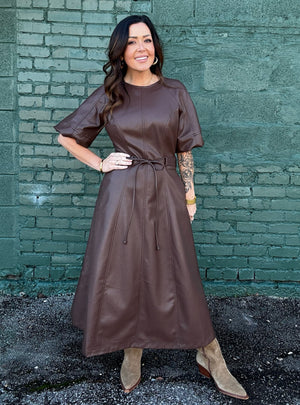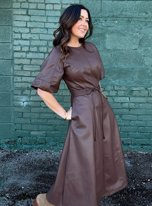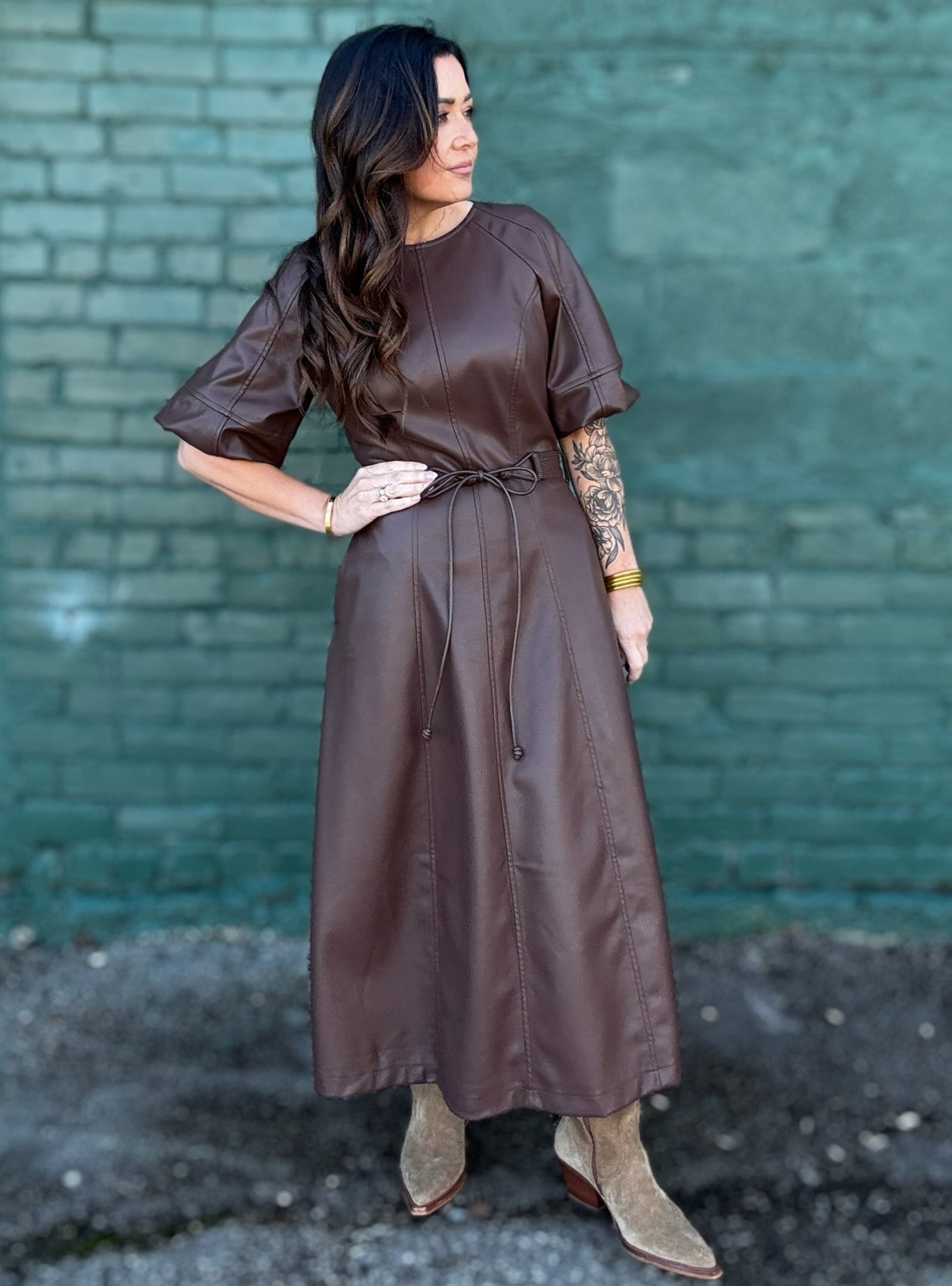 Meet the dress that turns every entrance into a moment. This rich chocolate faux-leather midi dress blends bold edge with timeless elegance. Designed with soft structure and clean seam detailing, it creates a beautifully shaped silhouette without feeling stiff.