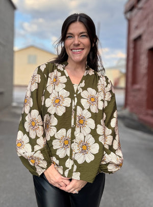This olive floral blouse is the perfect mix of playful and polished. Featuring oversized cream and mustard flowers, a relaxed fit, and soft gathered details at the neckline and cuffs — it’s effortlessly flattering and full of fall charm. Style it tucked into your favorite jeans for weekend brunch or pair with sleek trousers for a pop of pattern at the office.