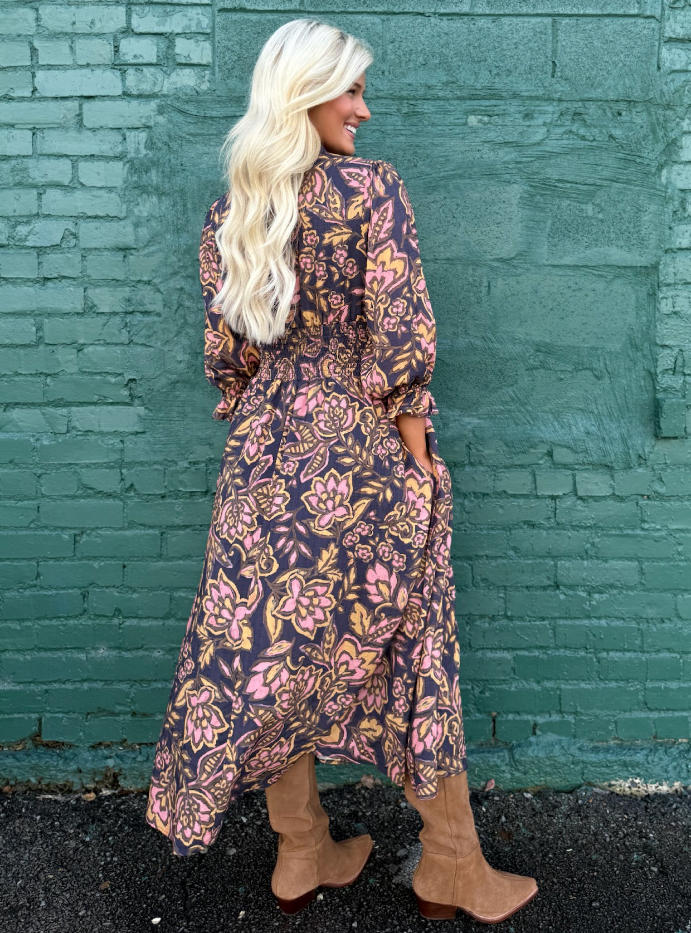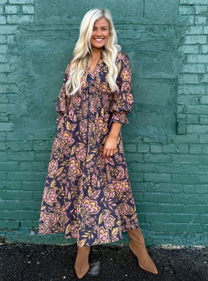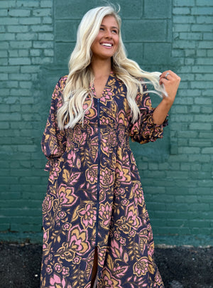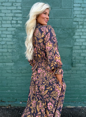 Romantic, moody, and effortlessly elegant — this floral midi is made for those days when you want to look put together with zero effort. The deep navy base sets the stage for warm golden and blush florals, giving the print a hand-painted feel, while the ruched waistline provides and ultra flattering silhouette.