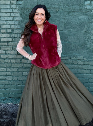 Wrap yourself in pure softness with this rich berry hued fuzzy vest by Renuar. The plush texture feels like a warm hug, while the stand collar and full zip front keep your look polished and cozy. Front pockets add both charm and function—perfect for chilly hands or holiday strolls. Whether layered over lace, knits, or basics, this vest instantly elevates any outfit with its chic, winter-ready charm.