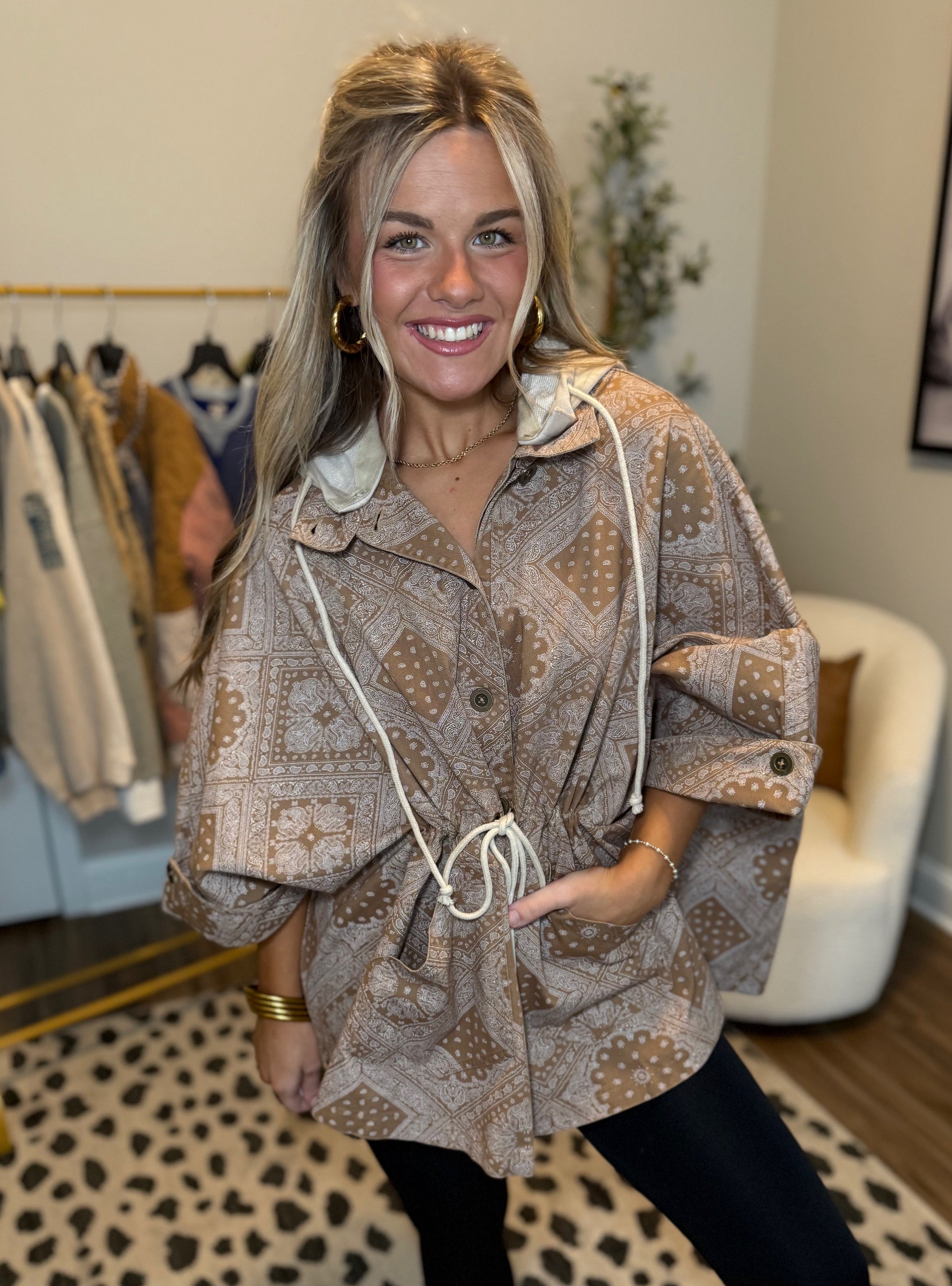Bring a touch of boho charm to your outerwear with this taupe bandana print jacket. Designed with a relaxed fit, roll-tab sleeves, removable hood, and a cinched drawstring waist, it blends effortless comfort with flattering shape. The lightweight fabric and neutral tones make it perfect for layering across seasons, while the playful bandana inspired pattern adds a unique twist to a classic style.
