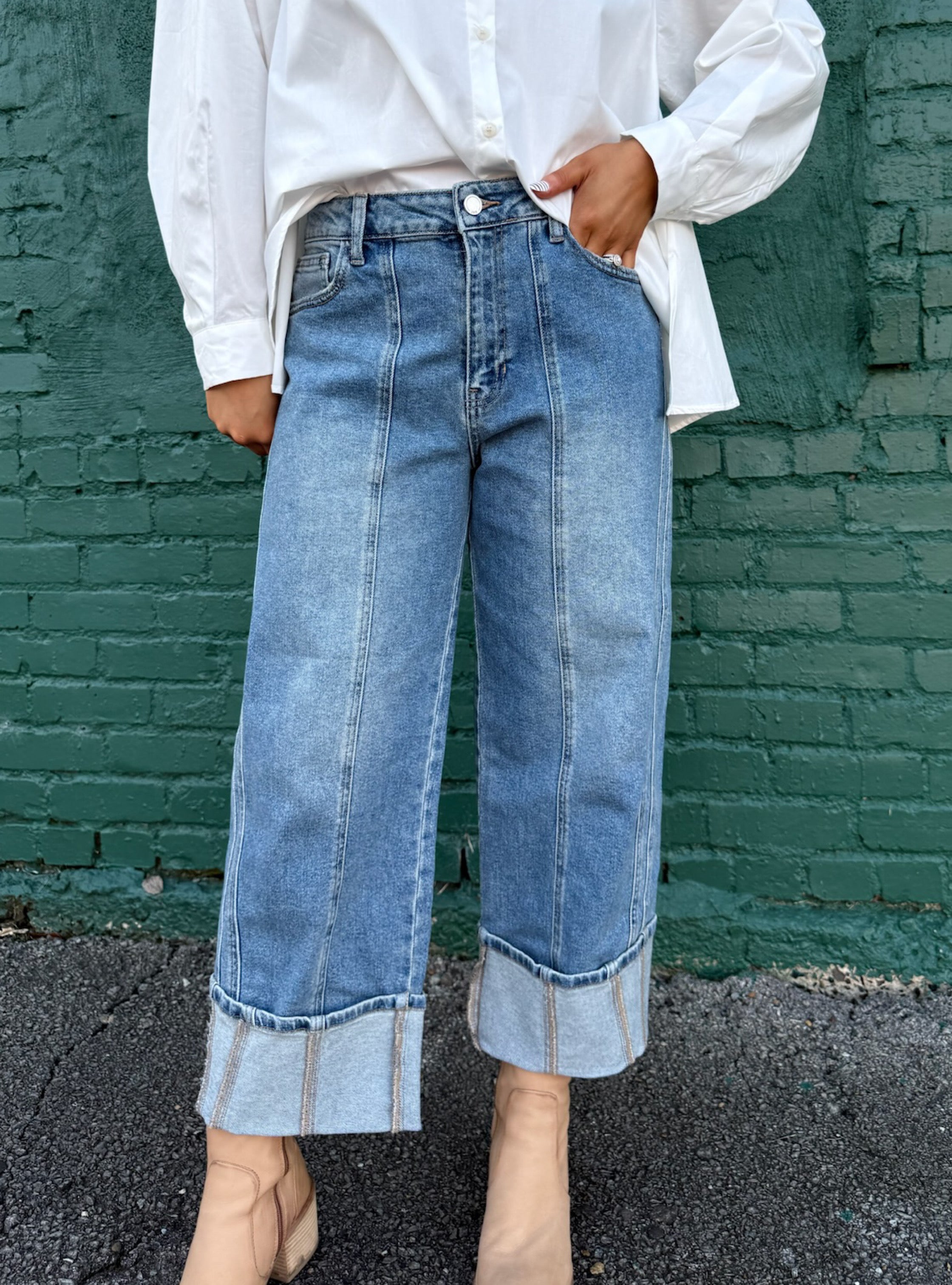 These jeans by Just Black Denim bring a modern twist to a classic denim moment. Featuring a wide-leg silhouette with structured front seams and dramatic cuffed hems, they deliver an effortless mix of polish and edge. The medium wash finish gives them a lived-in feel, while the tailored details keep things chic. Style them with a crisp white blouse or a cropped sweater for that perfectly balanced, cool girl look.