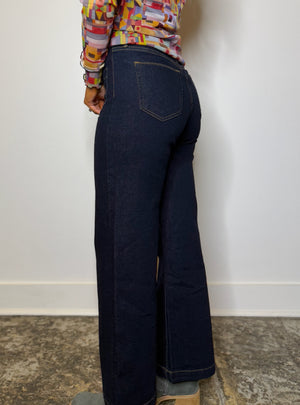 Proudly made in the USA, these jeans are a chic take on classic denim with a modern cut. They feature a high rise waist with front patch pockets and bold topstitching that adds structure and vintage inspired detail. The fit is slim through the hips before falling into a straight, wide-leg silhouette, creating a flattering and elongating look. The dark indigo wash gives them a polished finish—easy to dress up with a blouse or keep casual with a tee.