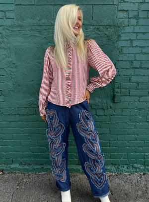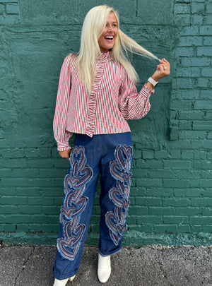 These statement denim jeans are full of heart—literally. With bold appliqué heart designs running down each leg, outlined in distressed edges for a lived-in vibe, they balance playful romance with edgy street style. The relaxed fit and deep indigo wash make them an easy pair to dress up with heels or keep casual with sneakers. Perfect for when you want your outfit to wear its heart on its sleeve (or in this case, your legs).