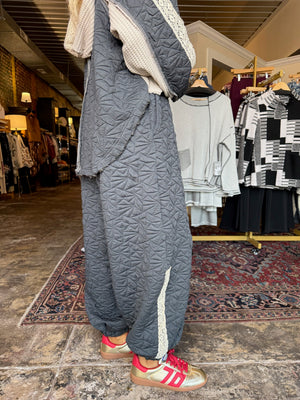 Cozy meets chic in these quilted jogger pants. Designed with a textured geometric stitch pattern, they bring a modern twist to loungewear while still feeling soft and effortless. The high rise elastic waistband with a rope drawstring tie gives them a relaxed, adjustable fit, and the crochet trim detail along the sides adds a touch of artisanal charm. Tapered legs with gathered hems make them perfect for pairing with sneakers or boots, whether you’re running errands or styling a laid-back weekend look.
