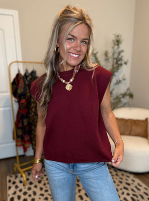 This sleeveless knit top features a rich burgundy hue that adds the perfect pop of color to any fall wardrobe. Designed with a relaxed, boxy fit and slightly padded shoulders, it offers a modern, structured silhouette while keeping things effortlessly chic. The soft knit fabric ensures comfort, while its versatile style makes it easy to dress up or down — pair it with jeans for a casual day out or tuck it into tailored pants for a polished look. Perfect for layering or wearing solo, this top is a timeless wardrobe staple.