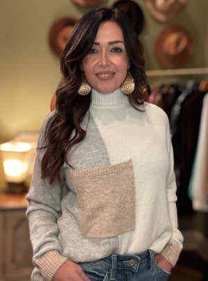 Cozy meets chic in this soft color block sweater by Renuar. Designed with a relaxed fit, it features a high ribbed neckline, drop shoulders, and a playful front pocket in a contrasting neutral knit. The blend of cream, light gray, and taupe tones creates a modern yet timeless palette, making it an easy go-to for both casual days and dressed-up evenings.