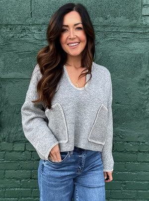 Simple, soft, and effortlessly stylish — this gray sweater is a must-have for any season. The contrast whipstitch trim adds just the right touch of detail, while the relaxed fit and front pockets make it as comfy as it is chic. Pair it with denim or leggings for that perfectly polished, laid back look.