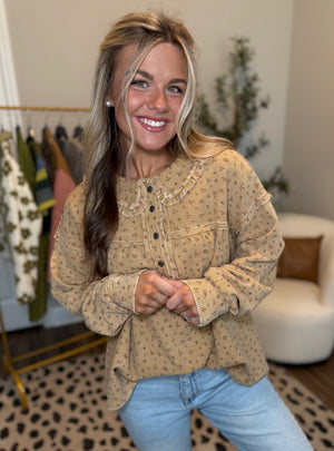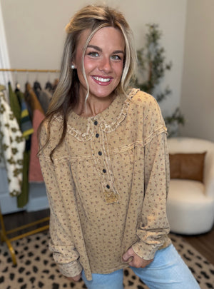 This top is a sweet blend of vintage charm and everyday comfort.It features a soft golden mustard base sprinkled with a delicate ditsy floral print, giving it a timeless, feminine feel. The Peter Pan style collar with a button front placket adds a touch of romance, while the relaxed fit and flowy silhouette keep it casual and effortless. Long sleeves and lightweight fabric make it perfect for layering through the seasons.