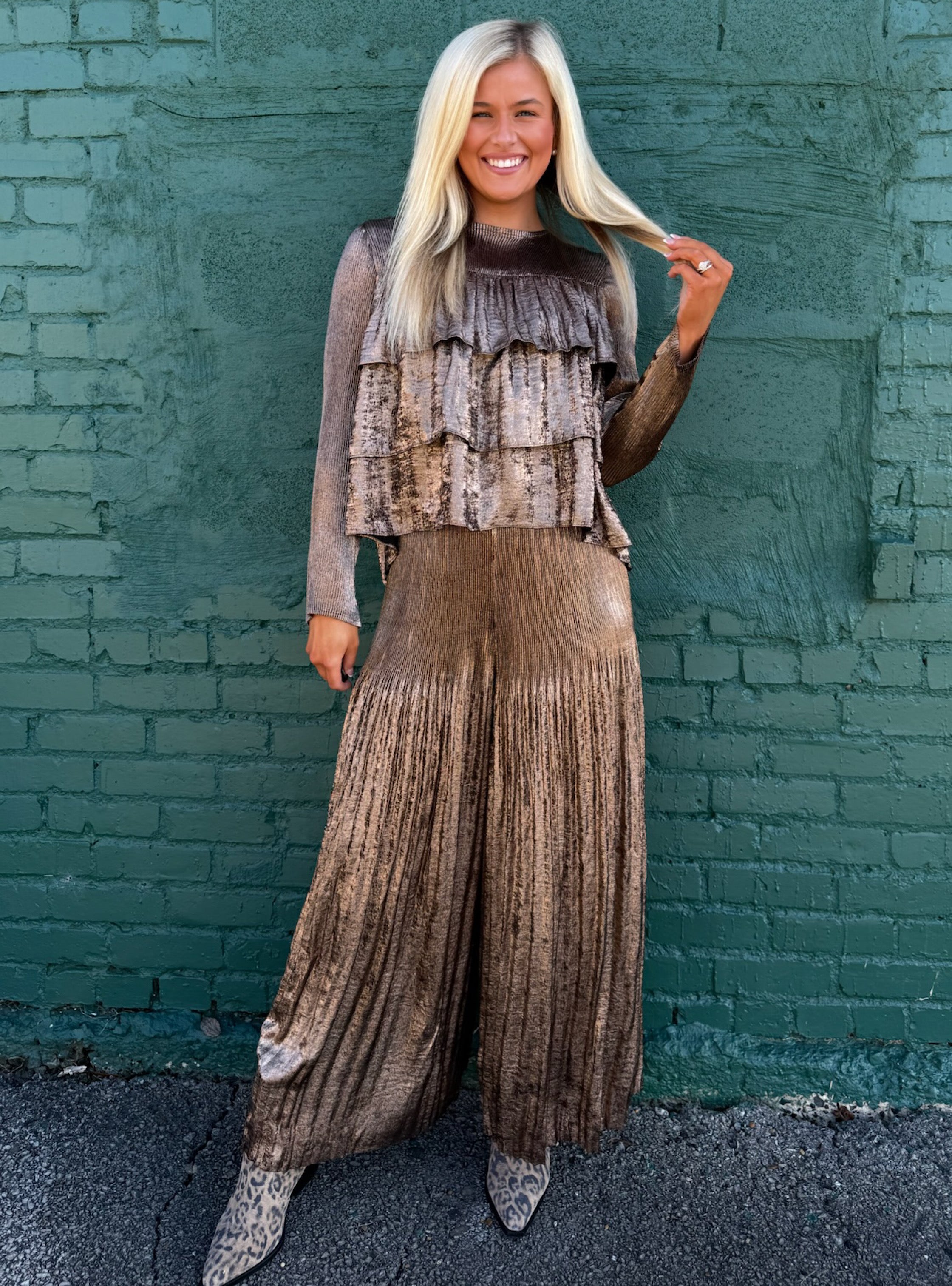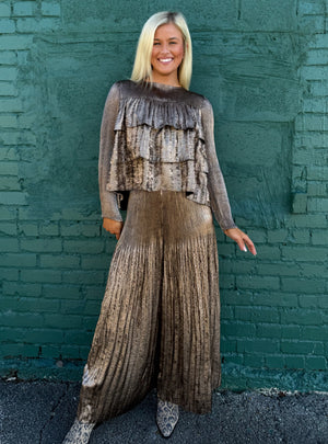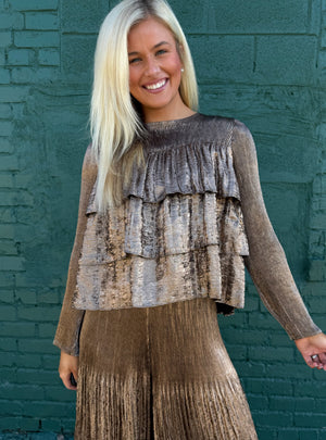 Bring all the glam with none of the effort in this luxe metallic tiered ruffle top by Current Air. Designed in the same dreamy sheen fabric as the matching pants, this piece glows with rich bronze and champagne tones that shift beautifully in the light. The tiered ruffle front adds soft dimension and movement, giving it that elevated, holiday feel.