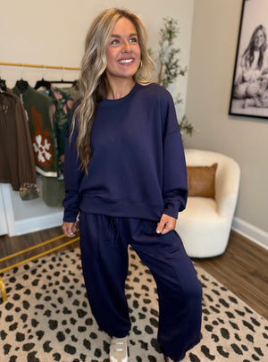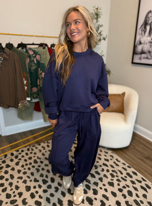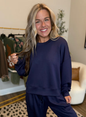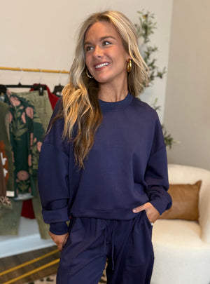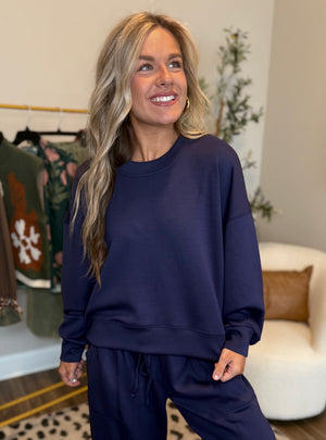 The perfect blend of comfort and style, this navy sweatshirt is your new go-to for laid-back days and effortless outfits. Featuring a soft, luxe fabric and a relaxed fit, it’s designed for all day coziness without sacrificing style. Dress it down with matching joggers for the ultimate lounge set or pair it with denim and sneakers for an easy, on-the-go look. A classic staple you’ll reach for again and again!