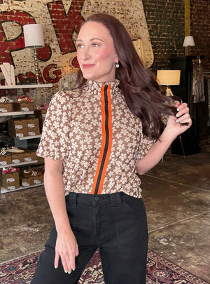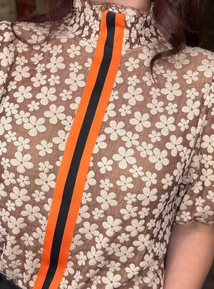 This retro chic blouse brings playful charm with its taupe base and daisy print overlay. A bold orange and black racing stripe runs down the front for a sporty-meets-feminine twist, while the ruffled mock neck and puff sleeves add a polished finish. Perfect for dressing up your favorite denim or pairing with sleek trousers, this top strikes the balance between vintage whimsy and modern edge.