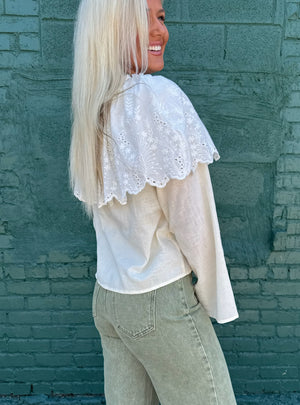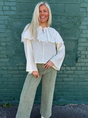 Featuring a soft, lightweight fabric and a scalloped eyelet ruffle neckline, this top brings a touch of vintage-inspired femininity to your wardrobe. The tie detail at the neckline adds a sweet, delicate finish, while the relaxed fit makes it easy to style for any occasion.