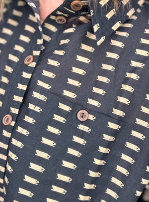 This button-down blouse is giving major coffee cup chic. The black base is sprinkled with a unique tan dash pattern that looks like rows of tiny coffee cups — a fun, unexpected twist on a classic print! With its relaxed fit, lightweight fabric, and subtle front pockets, it’s the perfect throw-on-and-go top for casual days, coffee runs, or office attire. Pair it with denim for an effortless vibe or dress it up with tailored pants for a polished, trendy look.