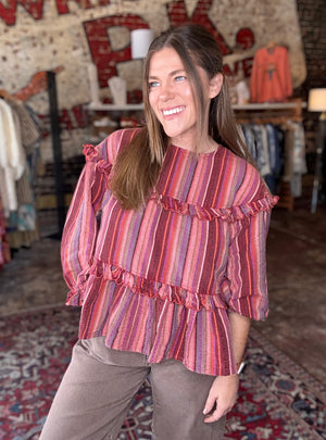 Featuring vertical stripes in rich fall tones—cranberry, mauve, rose, and dusty plum—creating a warm, eye-catching palette, this top by Ivy Jane is a must-have! The tiered ruffle details across the chest, sleeves, and waist add movement and a touch of feminine charm, while the relaxed, flowy fit makes it effortlessly comfortable. Its soft, textured fabric and subtle boho feel make it perfect for pairing with denim, corduroy, or wide-leg pants for an easy chic look that transitions beautifully into fall.