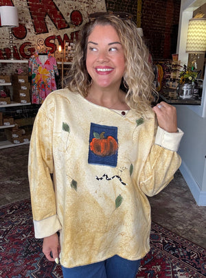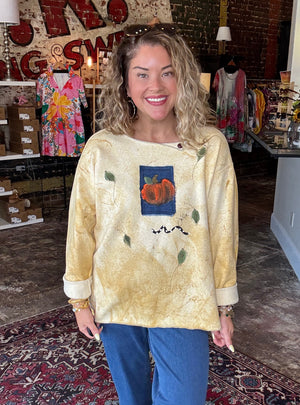 Add a touch of artsy charm to your fall wardrobe with this hand-painted pumpkin sweatshirt by Kunky’s. Crafted on a soft, cozy fabric, this one-of-a-kind piece features a beautifully painted pumpkin patch detail on a denim-style patch, accented by whimsical hand-drawn leaves and vines. The relaxed fit and rolled cuffs make it effortlessly stylish while keeping you warm and comfortable. Perfect for autumn outings, pumpkin patch trips, or cozy weekends.