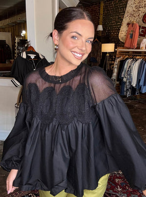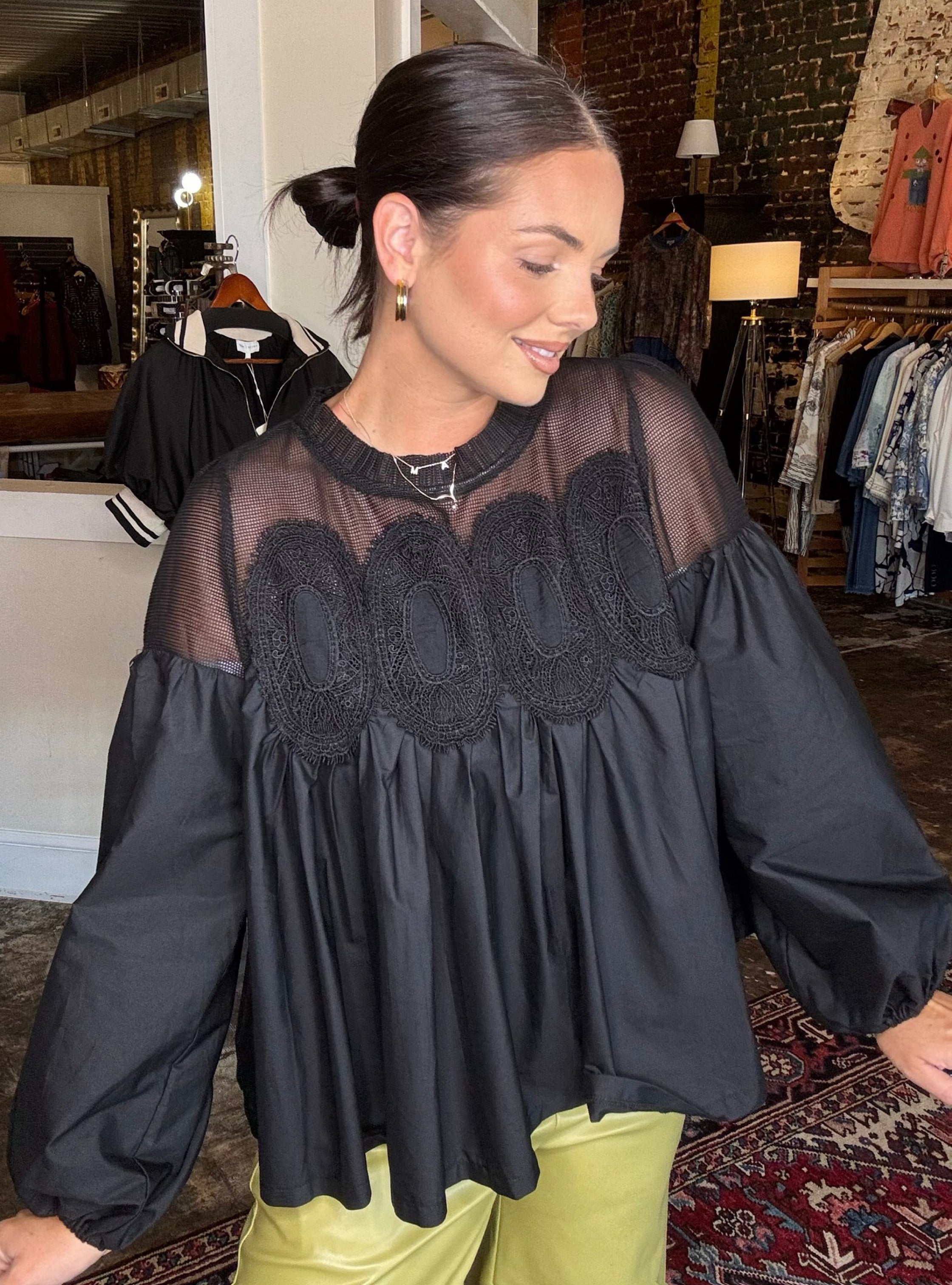 This black blouse is the perfect mix of romantic detail and modern edge. Featuring a sheer mesh yoke with intricate lace paneling across the chest, it adds just the right amount of drama while keeping things chic and elevated. The gathered bodice flows into a relaxed, billowy silhouette with voluminous sleeves finished with subtle elastic cuffs for a feminine touch. Lightweight and airy, it’s an effortless statement piece that pairs beautifully with sleek trousers, denim, or leather for a boutique-worthy look that transitions seamlessly from day to night.