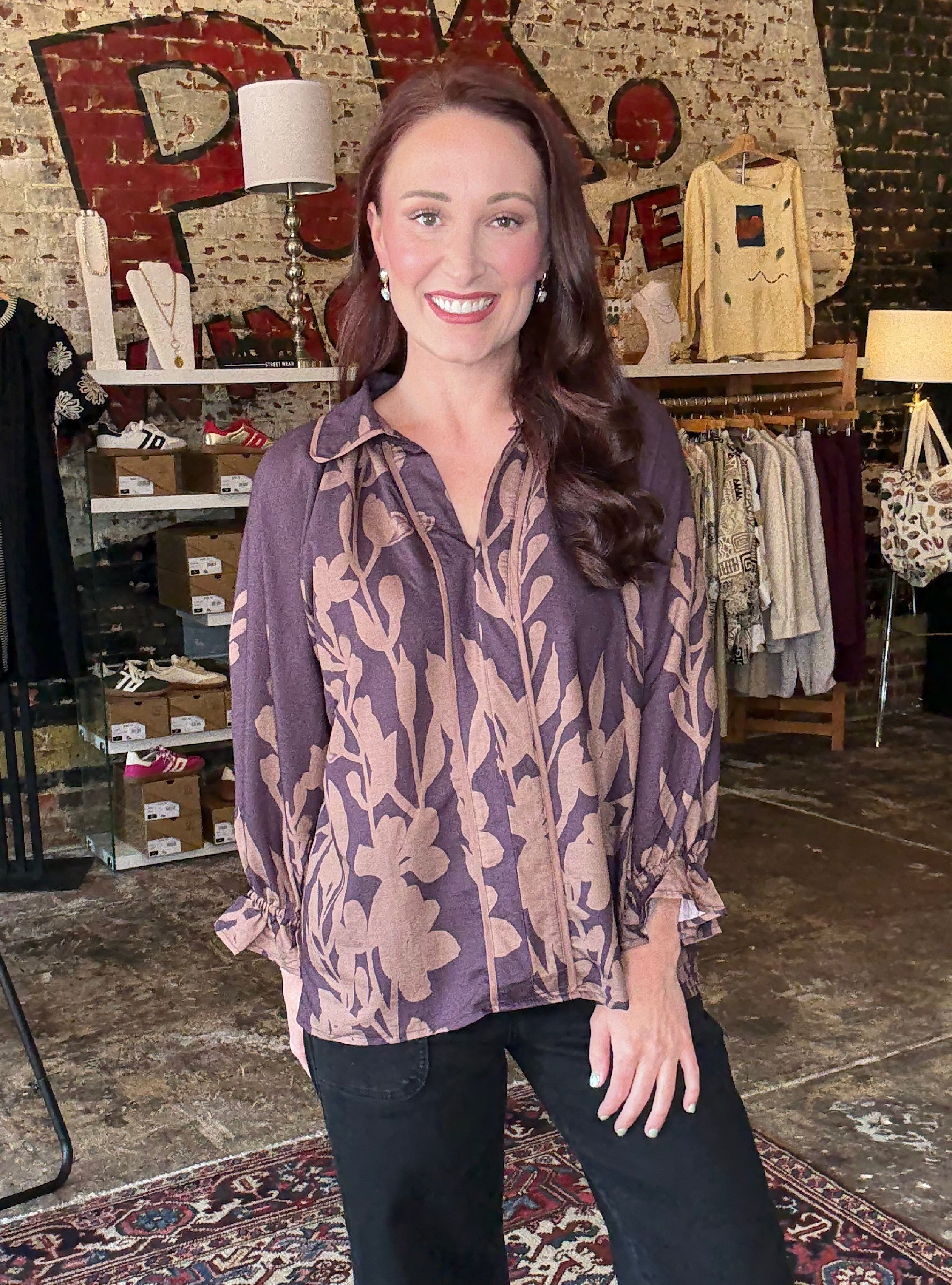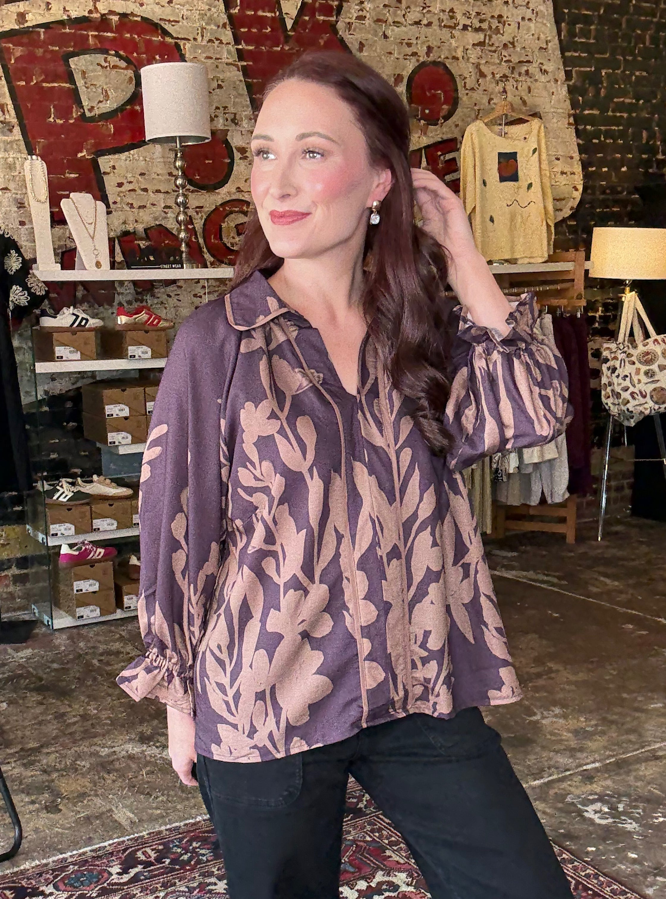 Make a statement in this flowy blouse, featuring a deep plum base with bold taupe botanical prints. The relaxed fit and airy silhouette give it effortless movement, while the gathered sleeves with subtle ruffle cuffs add a feminine finish. Perfect for pairing with dark denim or trousers, this top brings a touch of modern elegance with an artsy twist.