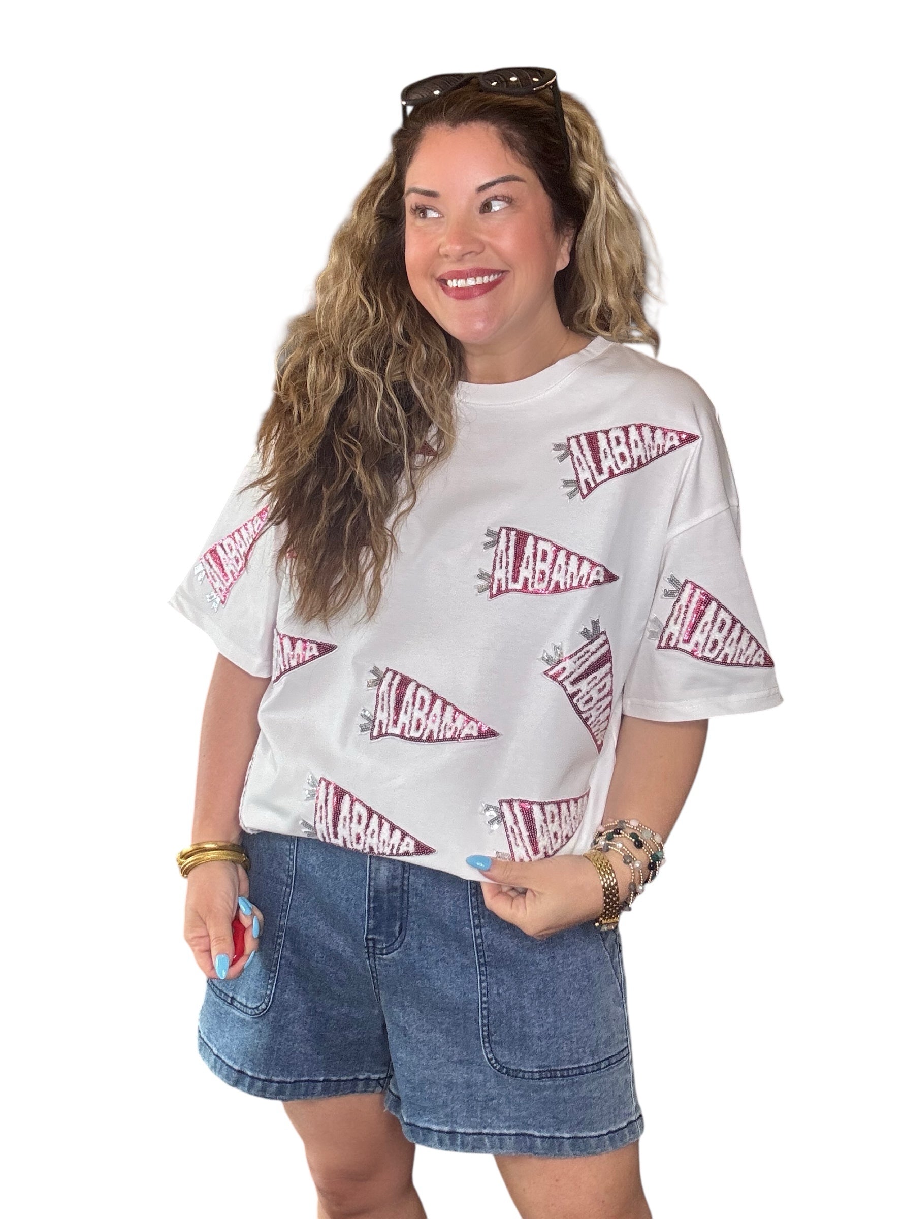 Loudly cheer on your team in our favorite game day t-shirt. Adorned with sequined Alabama banners all over the white bodice for a fun look! Sizing up is recommended for a more relaxed, easy fit.