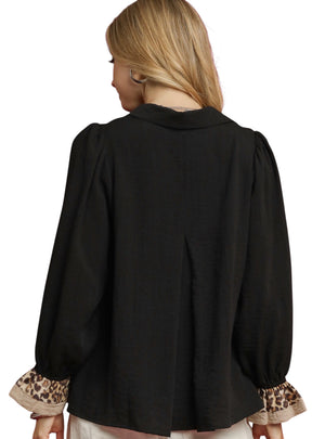 Add a little wild to your wardrobe with this chic black top! Featuring soft, flowy fabric and playful leopard print accents on the collar and cuffs, it blends effortless comfort with a touch of bold detail. The relaxed fit and billowy sleeves make it perfect for everyday wear, while the neutral tones keep it versatile for any season. Pair it with denim, trousers, or your favorite skirt for an easy, elevated look!