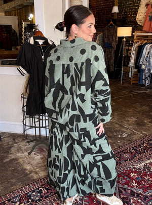 This button down top by Shana Apparel is a playful, artsy dream. Featuring a mix of bold black polka dots, tiny dotted detailing, and abstract geometric shapes, it’s a statement piece that effortlessly blends modern edge with boutique flair. The muted sage-green base softens the look, while the relaxed, oversized fit keeps it comfy and chic. Perfect for styling with the matching lantern style pants for a head-to-toe moment or pairing with a simple denim to let the print do all the talking. A true standout for anyone who loves mixing prints and making a statement!