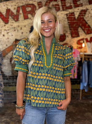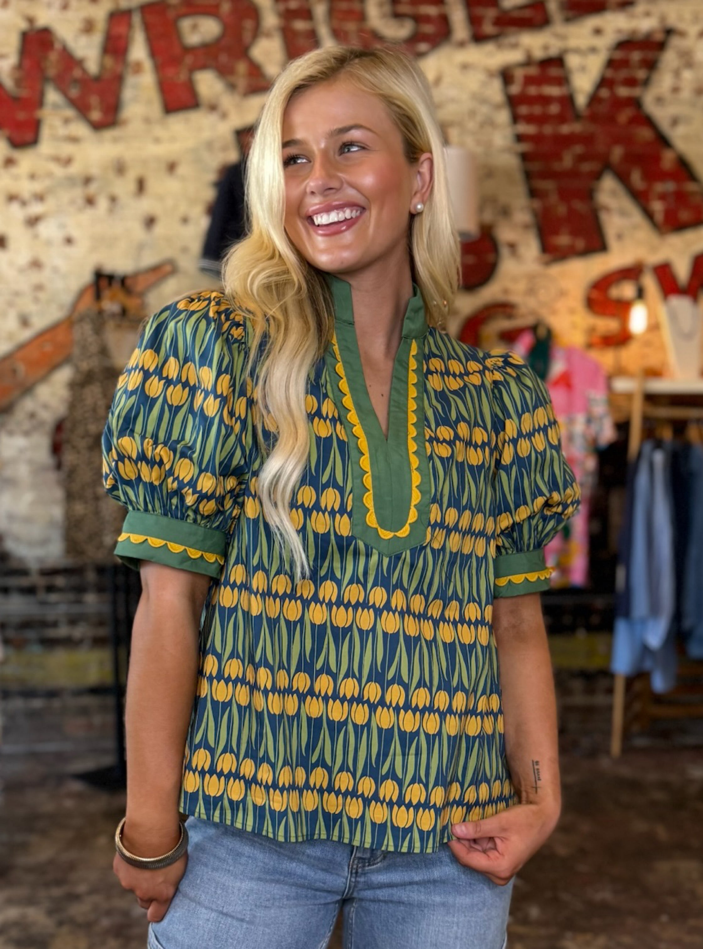 This vibrant puff-sleeve blouse features a lively yellow tulip print against a deep blue and green backdrop. The split neckline is accented with a scalloped yellow trim and solid green placket, adding a charming contrast. Coordinating green cuffs with matching scalloped edging complete the playful, retro-inspired look. Perfect for adding a cheerful pop of color to any casual outfit.