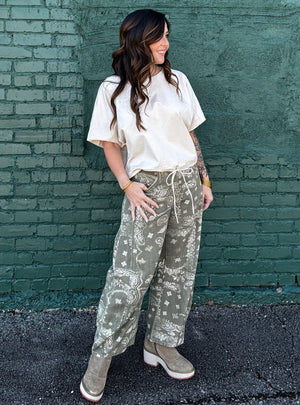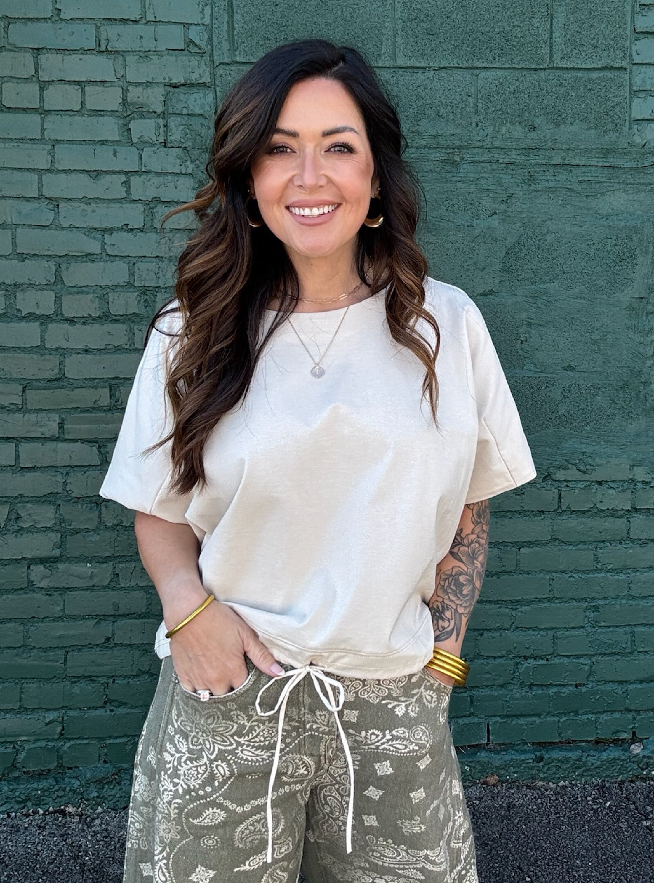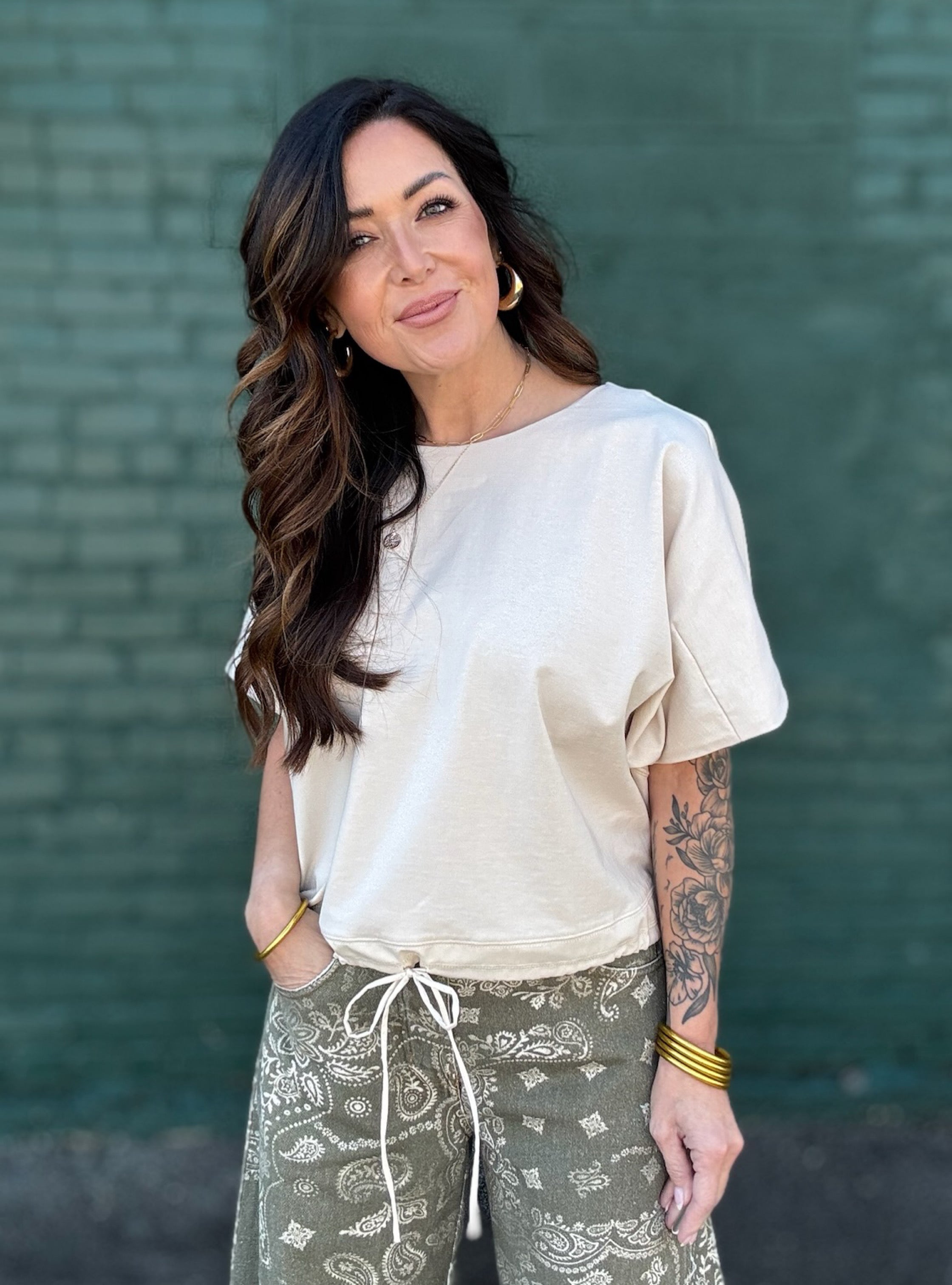 This top is the definition of effortlessly elevated — a soft, neutral cream tee with an easy, relaxed silhouette and subtle drawstring hem for that just-right shape. The smooth texture gives it a polished touch, while the loose sleeves keep it casual and comfy.