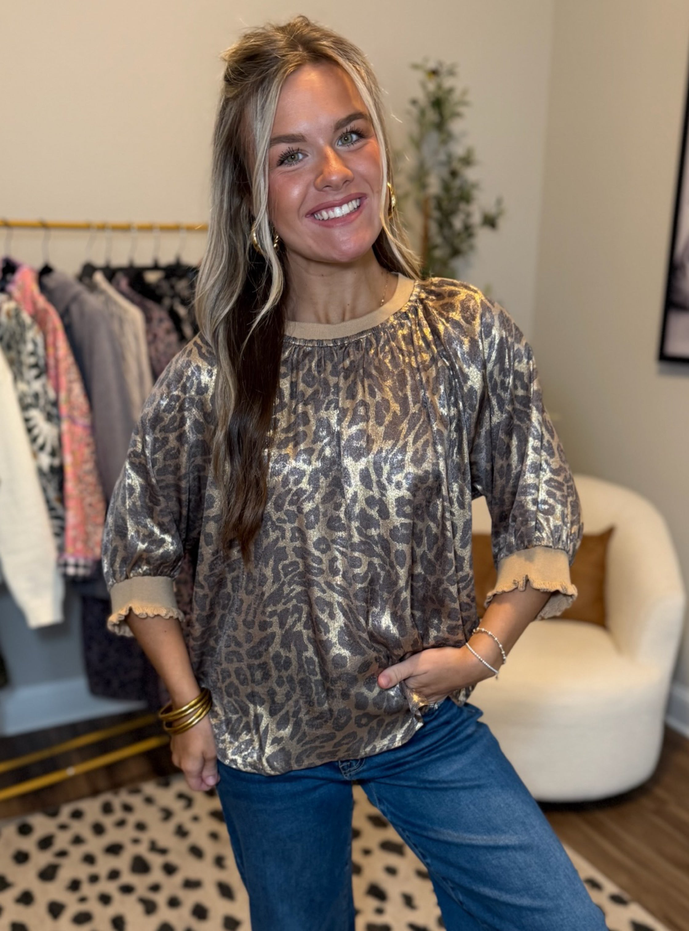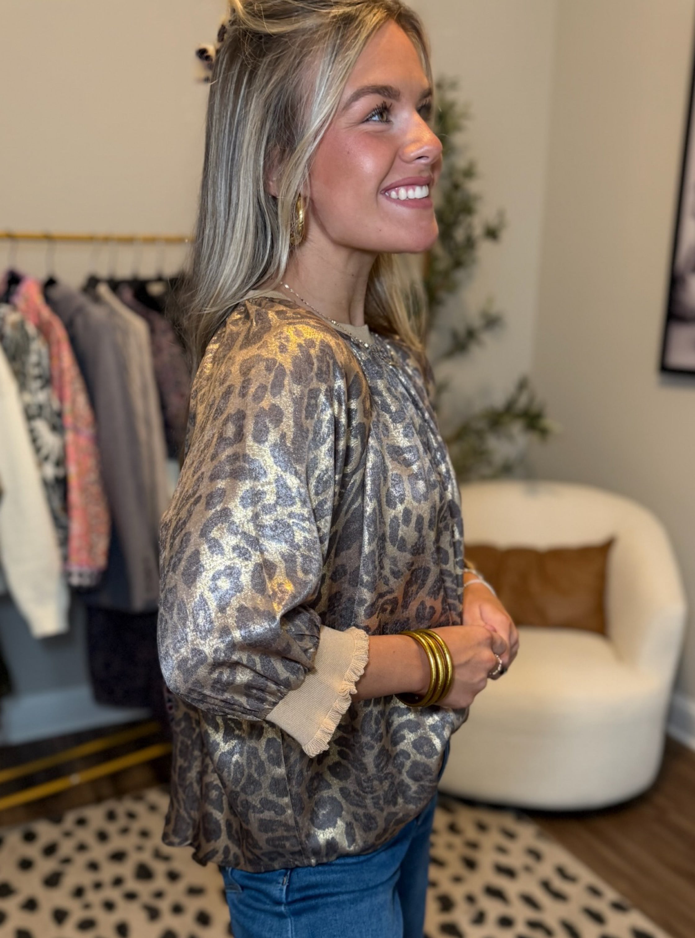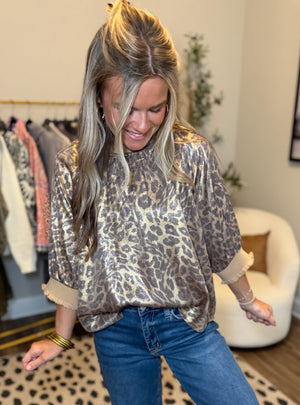 Turn every room into your runway with this shimmer kissed leopard top. The metallic finish brings a glam twist to a classic print, while the relaxed silhouette keeps it effortlessly chic. Soft cuffed sleeves with subtle ruffle trim add the perfect feminine touch, and the mock neckline gives it that elevated, holiday feel you’ll love.