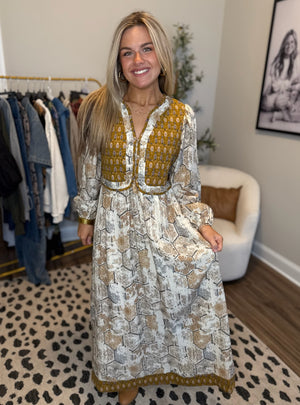 Boho meets timeless charm in this dreamy maxi dress. Featuring a patchwork inspired print in warm honey, taupe, and ivory tones, this dress brings vintage flair with a modern twist. The contrasting golden bodice quilted detail adds dimension and just the right pop of color, while the gathered skirt flows effortlessly for that free-spirited feel.