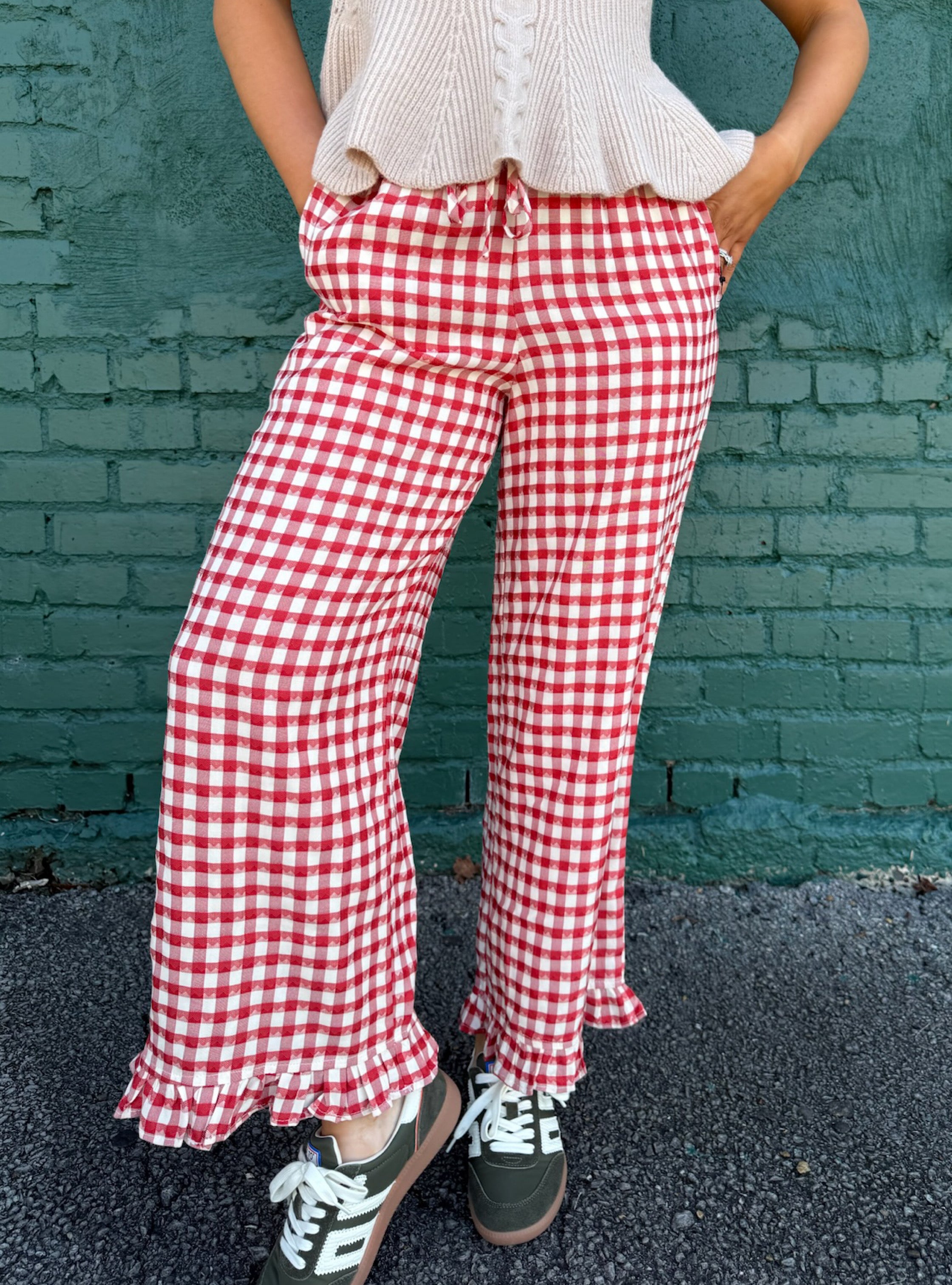 Sweet, comfy, and full of charm — these red gingham pants are an instant mood boost! With their relaxed fit, drawstring waist, and ruffled hem, they’re perfect for cozy weekends or styling up with a fitted sweater for that effortless “cute without trying” vibe.